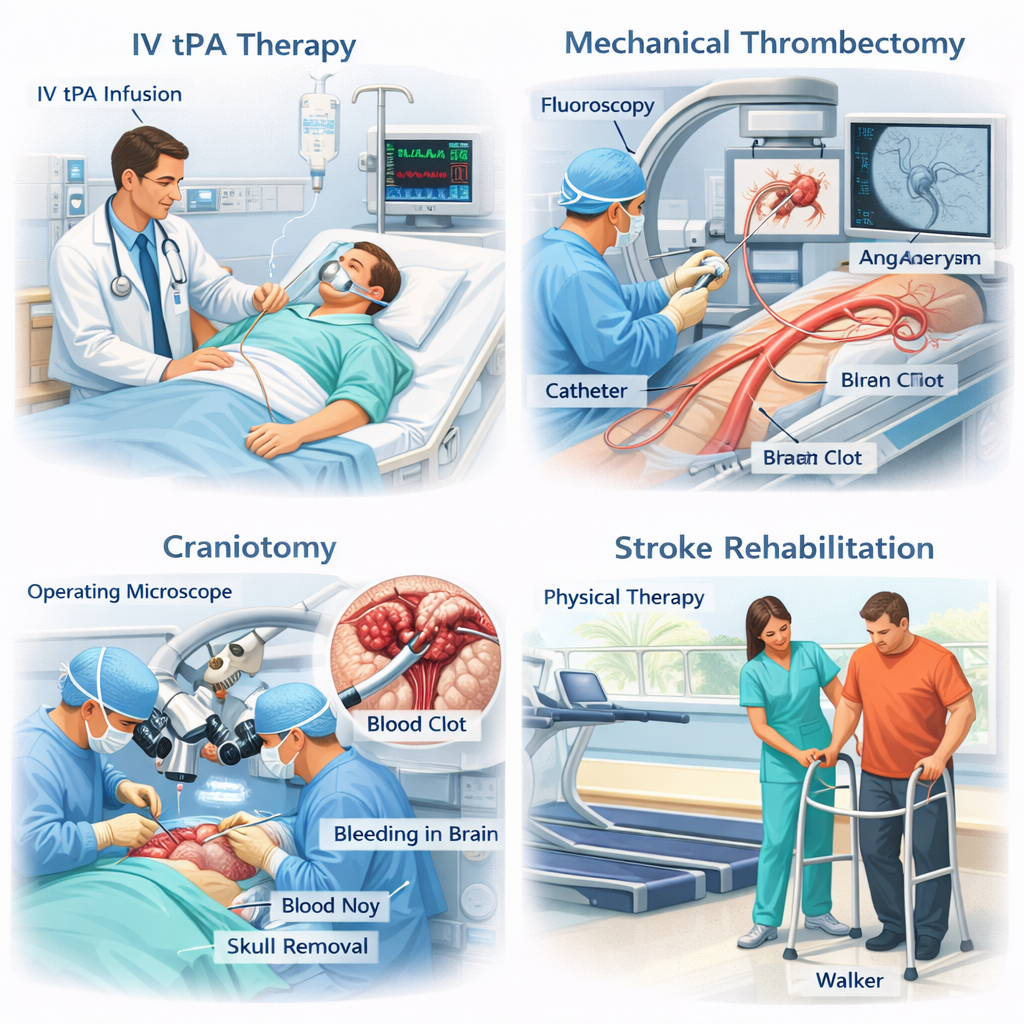 Treatment depends on the type and severity of stroke. In ischemic stroke, clot-dissolving medication (thrombolysis) may be administered within a specific time window to restore blood flow. In selected cases, mechanical thrombectomy—a minimally invasive procedure to remove the clot—can significantly improve outcomes.