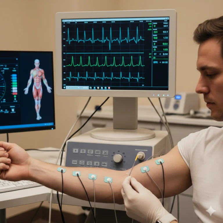 Electromyography (EMG) is a specialized diagnostic test used to evaluate the health of muscles and the nerve cells that control them. These nerve cells, known as motor neurons, transmit electrical signals from the brain and spinal cord to the muscles, enabling movement. When these signals are disrupted due to nerve injury or muscle disorders, patients may experience weakness, pain, or abnormal muscle activity. Electromyography helps detect and measure these abnormalities with precision.